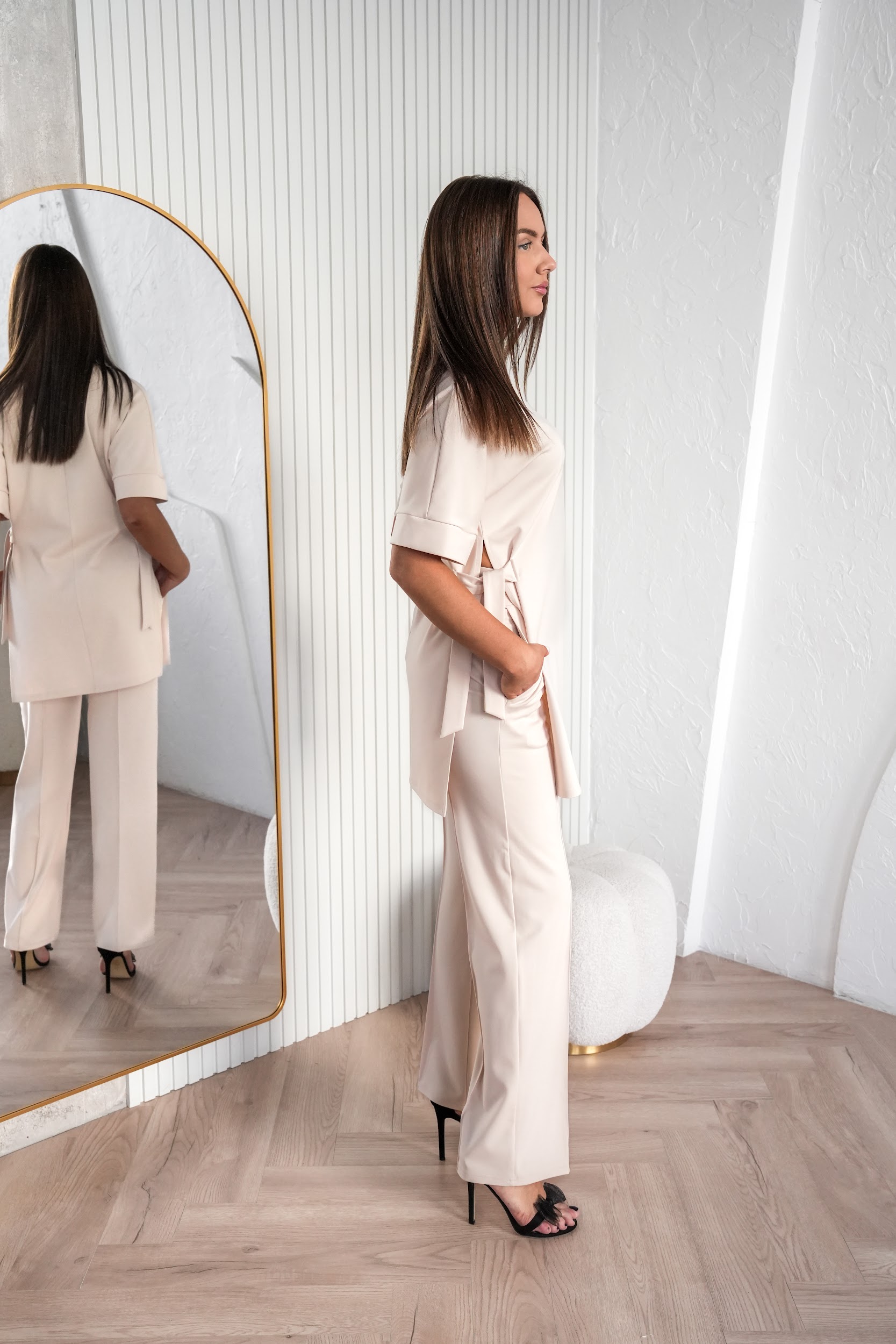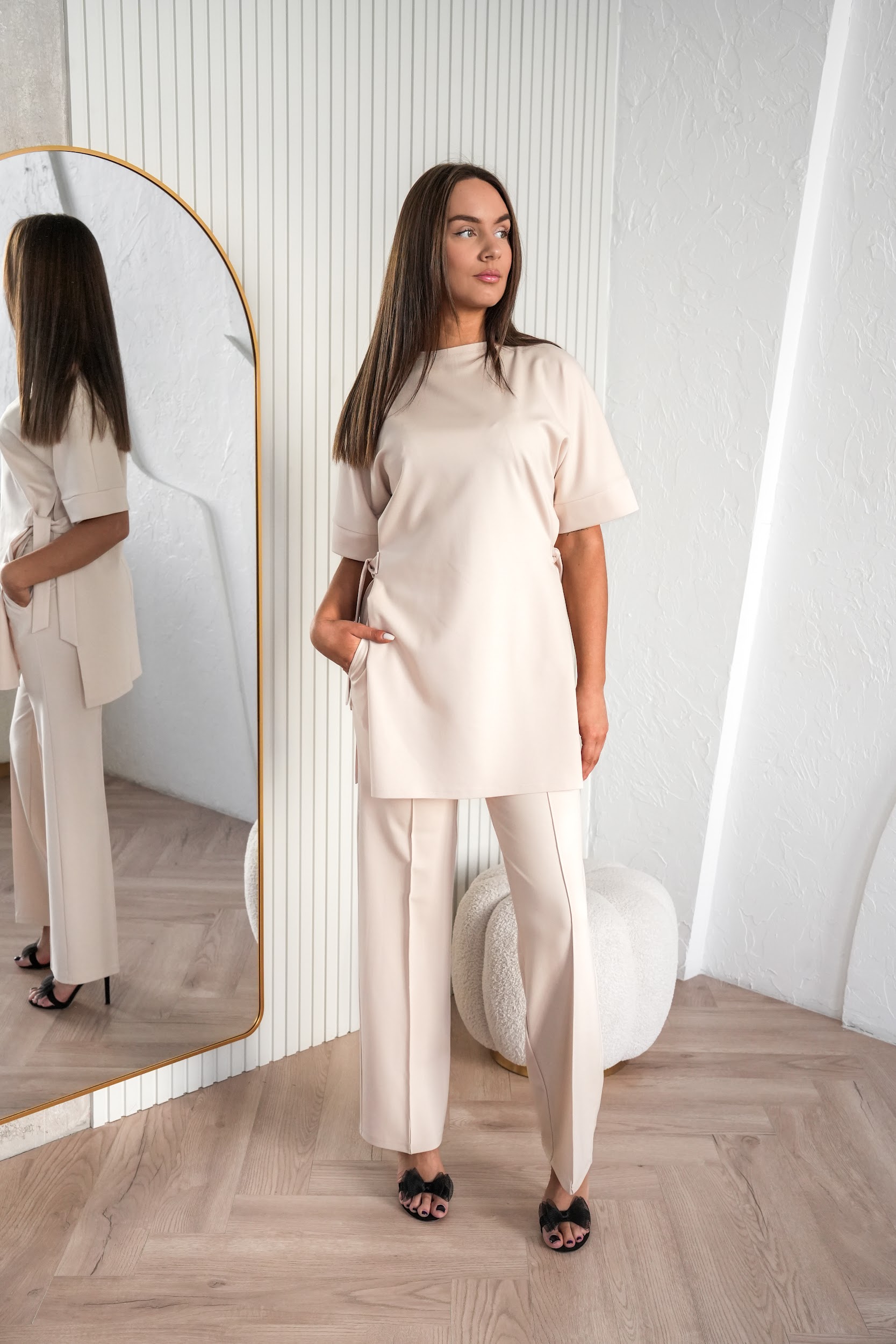 Tuunika külgedel olevad paelad võimaldavad istuvust reguleerida vastavalt soovile – kanna vabamalt või seo taljet rõhutavamaks. Hoolikalt läbimõeldud lõige sobib nii argipäeva kui ka pidulikumate hetkede jaoks, olles lihtsasti kombineeritav pükste, seeliku või kontsakingadega.