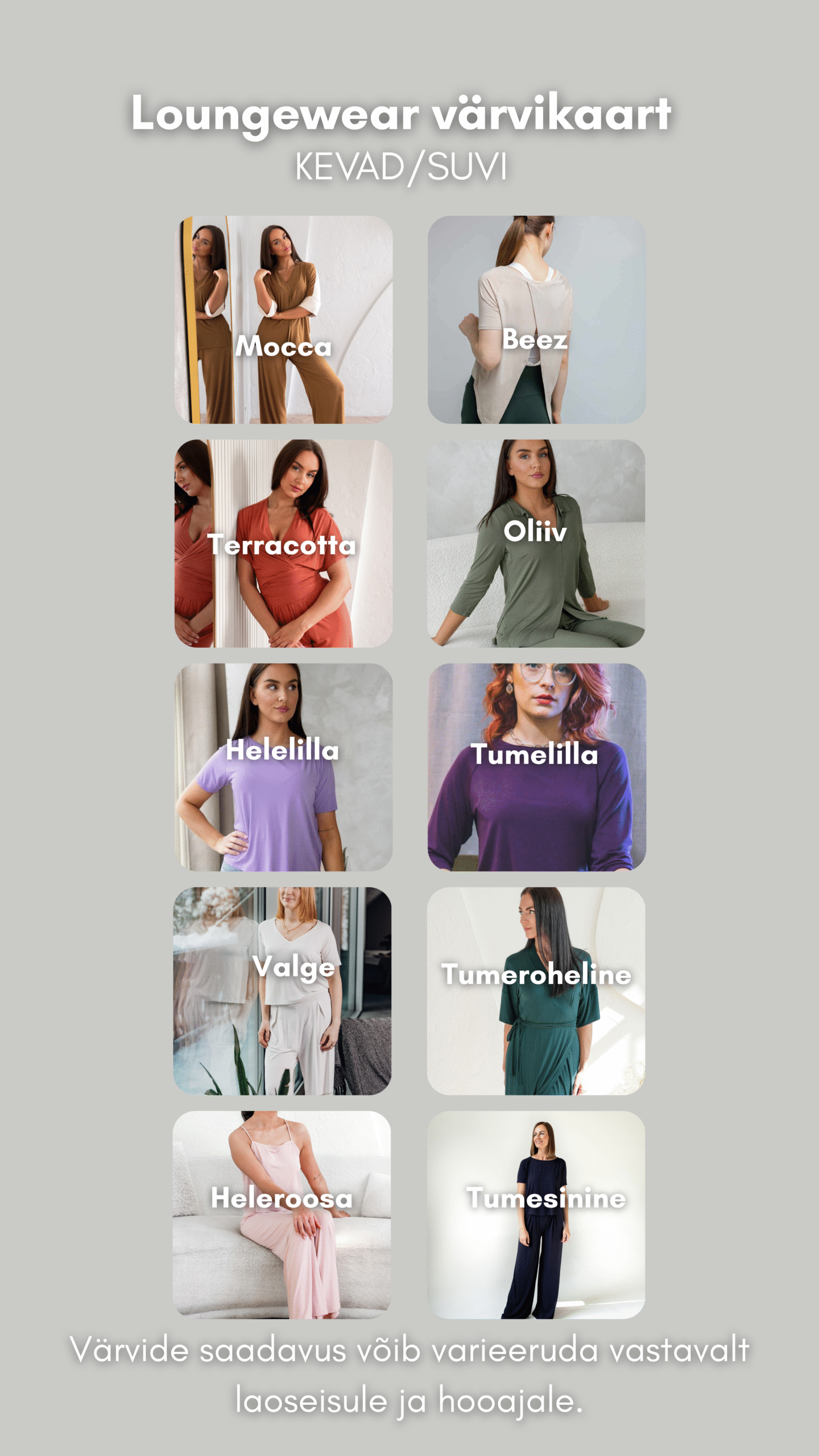 Mocca, Terracotta, Beež, Oliiv, Helelilla, Must, Valge, Tumeroheline, Roosa, Tumesinine, Tumelilla